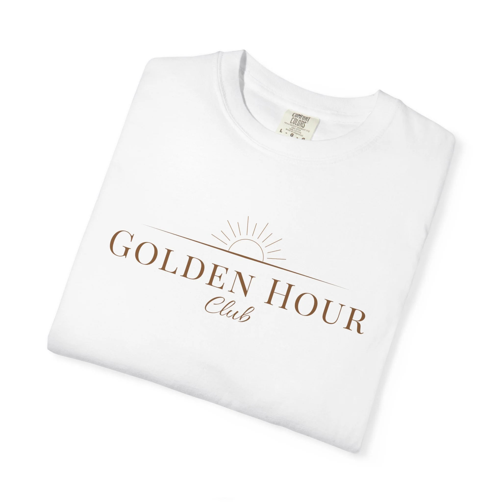 Golden Hour Club T-Shirt | Minimal Script Logo, White Tee