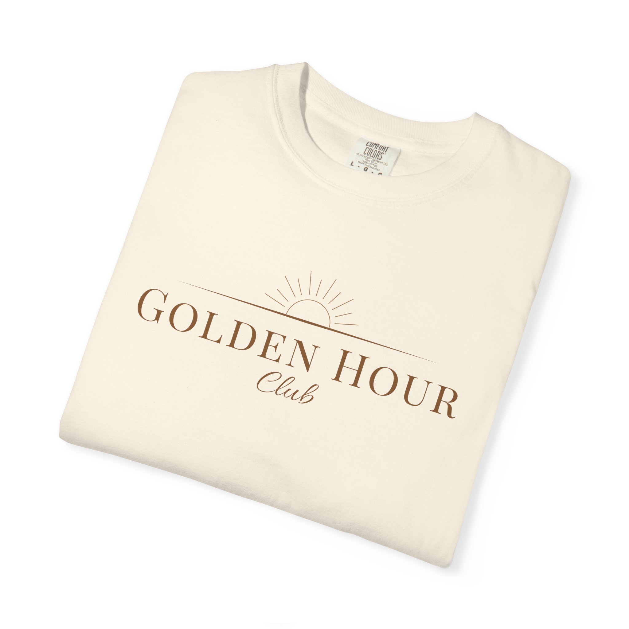Light, quiet, and just a little nostalgic — this garment-dyed tee reads "GOLDEN HOUR Club" in soft, sun-washed lettering that catches light without shouting. The heavy-weight cotton has a lived-in hand from the dye process, so it drapes easily over shoulders and settles into place like an old favorite. Wear it on slow, late-afternoon walks, at backyard evenings when the sky turns honey and rose, or layered under a jacket for sunset drives. It’s for people who savor the small pause between day and night: the cool breeze, the warm glow, the conversations that slow down. The relaxed fit and durable double-needle stitching mean this tee will age with you — softer, more comfortable, and more personal each season.